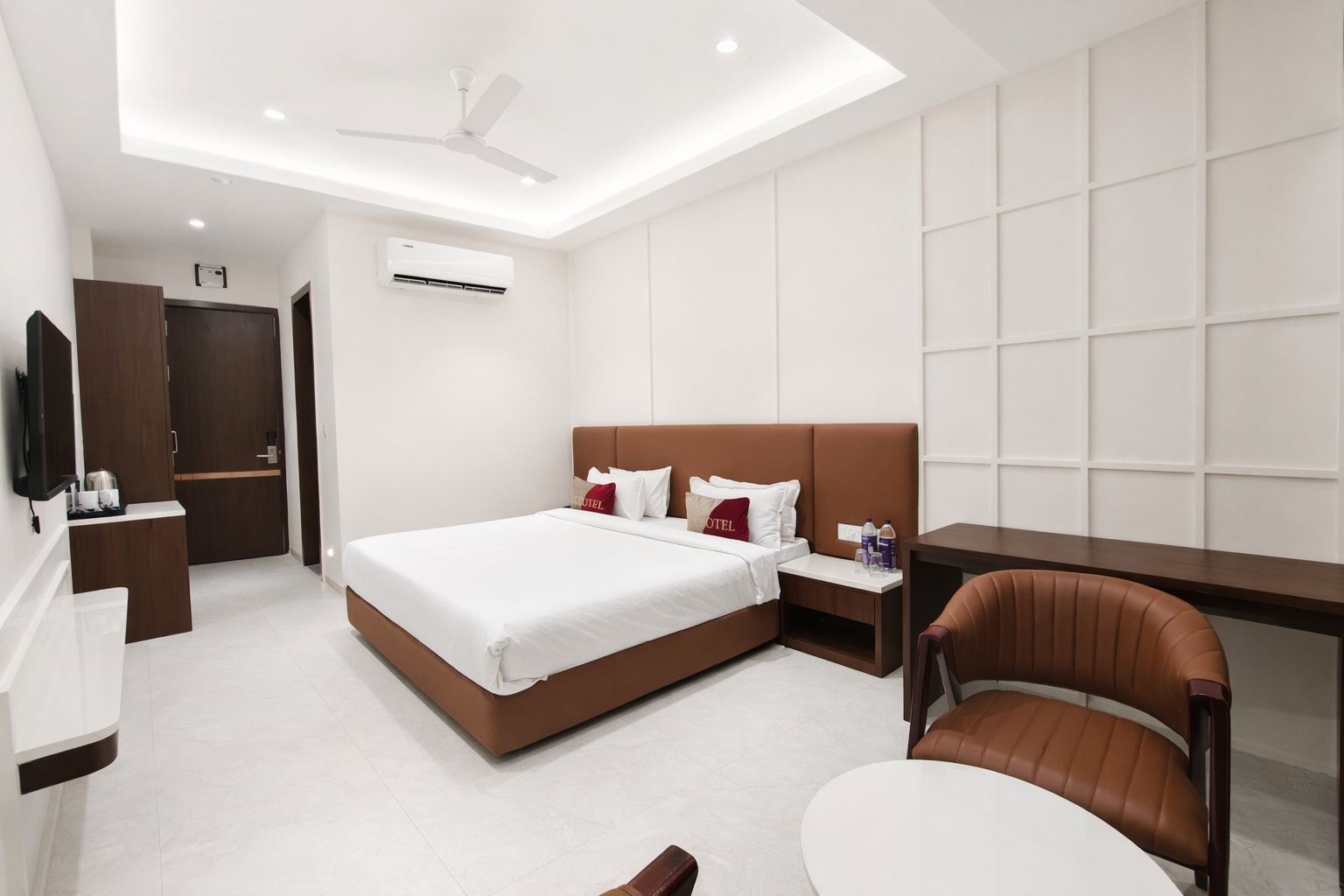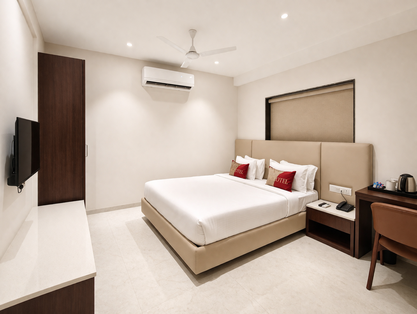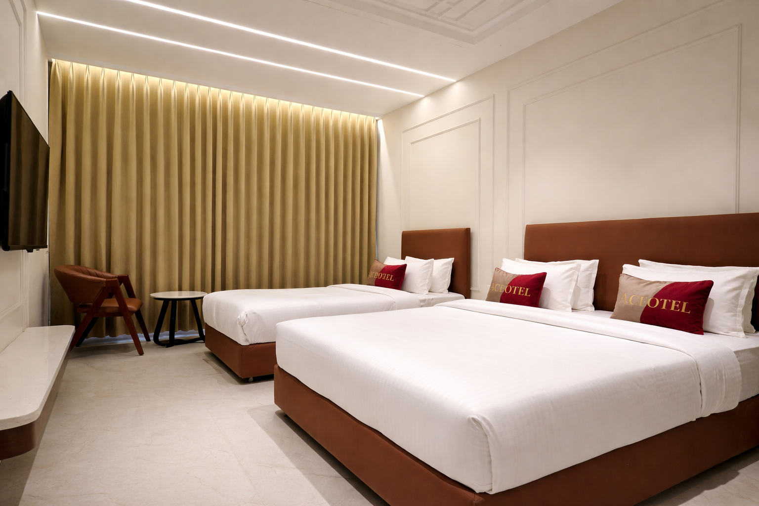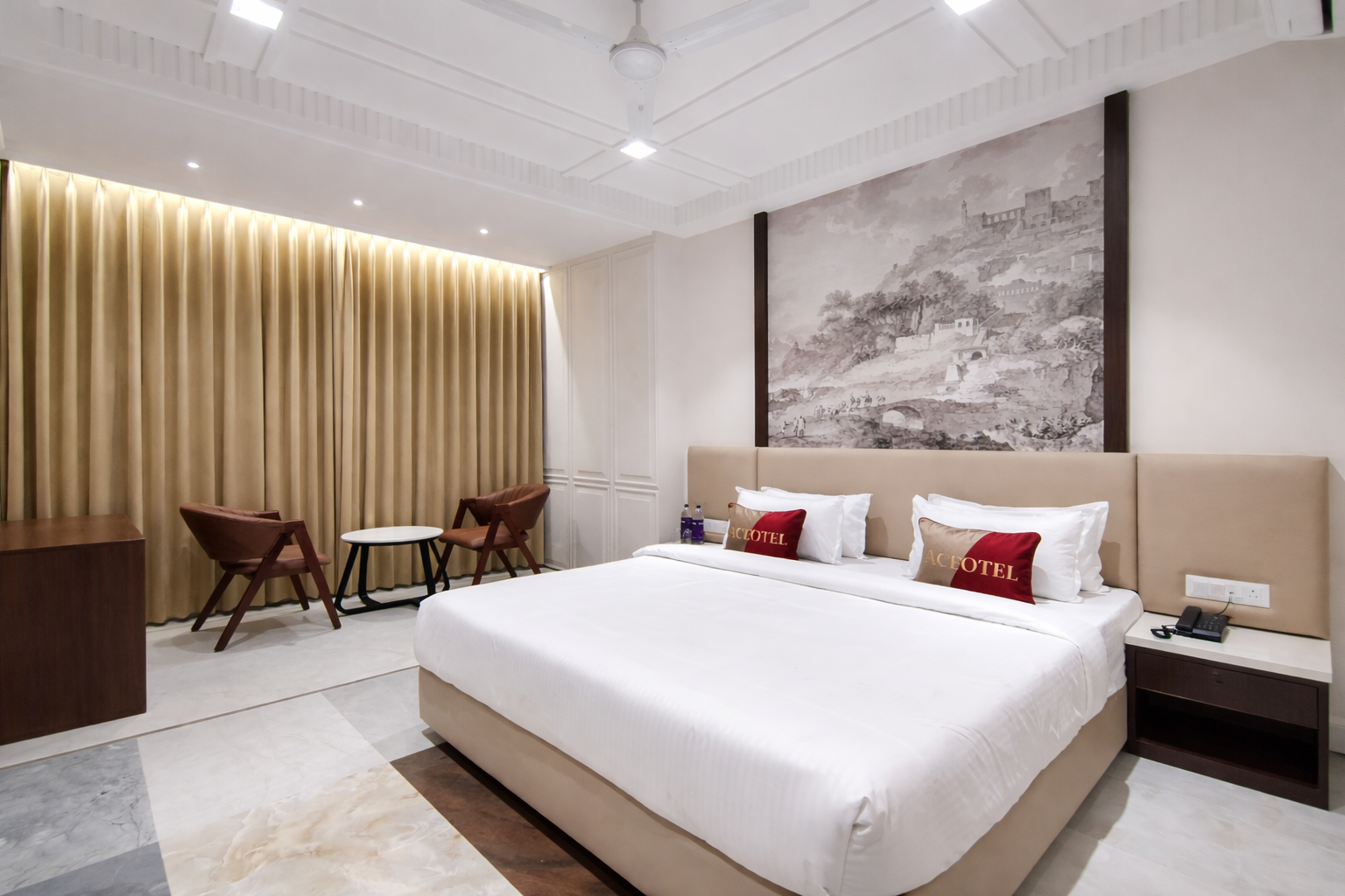 Experience comfort and elegance in our spacious Ace Deluxe Rooms, spread across 224 sq. ft. Each room features a king-size bed with an orthopedic mattress, a cozy sofa and chair, a writing desk, and a 55-inch LED TV. Stay connected and entertained with multipurpose Bluetooth telephones with FM, clock, and multimedia functions. Additional amenities include a mini bar, hair dryer, tea/coffee maker, complimentary bottled water, and a well-appointed bathroom with premium bath amenities.